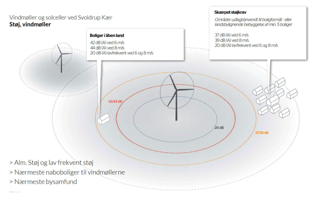 Af nedenstående kort fremgår det, at det planlagte vindmølleprojekt overholder støjkravene med god margin ved alle nabobeboelser i det åbne land, det samme billede gør sig gældende ved en vindhastighed på 8 m/s. For områder med støjfølsom arealanvendelse overholdes støjen også, dog er der rejst en enkelt vindmølle ved Havbro hvor støjen er tæt på bygrænsen, når den beregnes med de 6 nye planlagte vindmøller.
